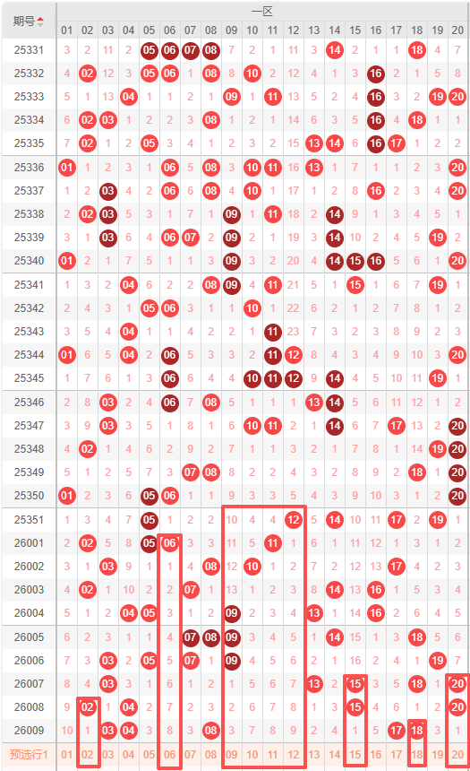一区:最近一区10期出号情况为:5 4 4 4 5 5 5 5 4 5,总出号情况为46个,平均出号4.6个,本期一区号码推荐出号为:02 06 09 10 11 12 15 18 20。重点关注:06 09 10 12 15。