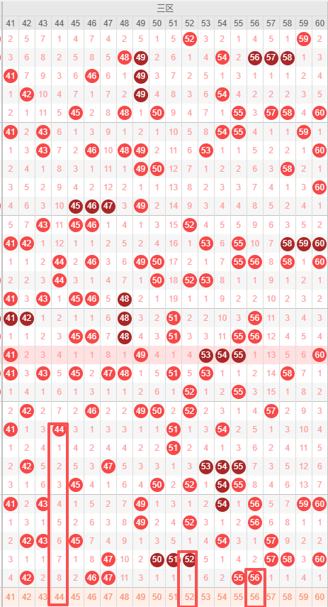 三区:最近三区10期出号情况为:6 4 1 5 5 7 2 5 7 5,总出号情况为45个,平均出号4.5个,本期三区号码走势推荐:44 51 52 56,重点关注:44 52 。