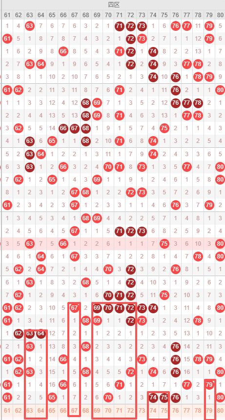 四区:最近四区10期出号情况为:3 5 10 6 3 3 7 7 5 7,总出号情况为56个,平均出号5.6个,本期四区号码推荐:63 64 67 69 70 71 72 74 75 79,重点关注:64 67 69 70 71 72 74 75 79。