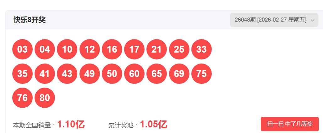 一、快乐八2026048期开奖号码