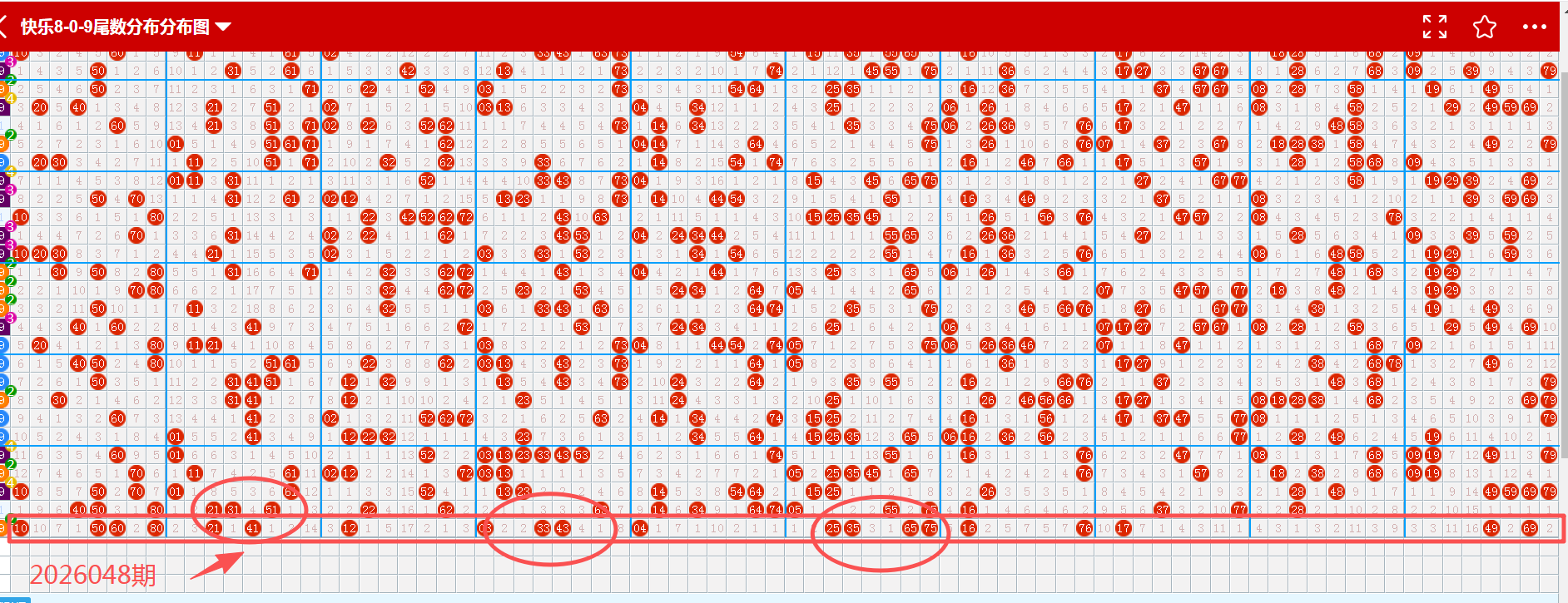 从2026048期重码走势图上看,画蓝色方框图标的是开出来的重码,开出了5个(蓝色方块标示的),重码数量与上期增加;从重码图上看,近5期重码下号数量有呈现升温的趋势。从近期重码下号数量的比对,可以发现中奖号码数理在1-10个号码之间均衡下号,所以本期判断重码热度回温概率极大,本期推断可以参考6个左右(蓝色箭头标示的);建议多加关注(03、17、25、43、65、75);