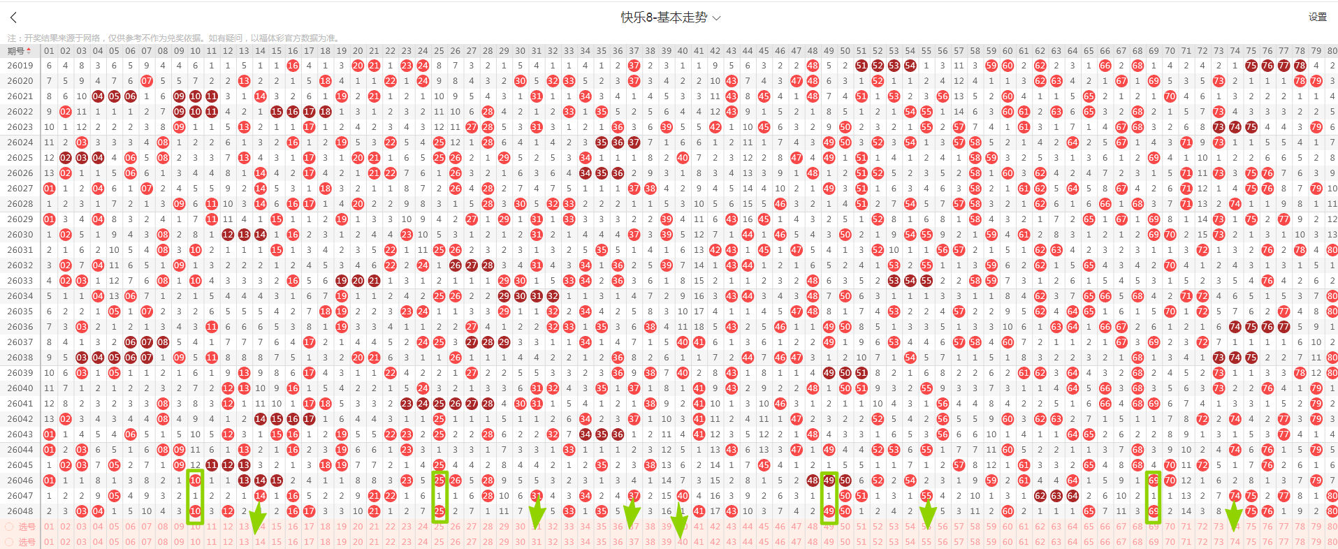 从这张走势图可以看到我画标出来了遗漏示意号码,开出了隔期(遗漏一期的)4个号码(绿色方块标示的),数量与上期增加,从近期走势图看隔期码回温态势形成,本期判断热度回温,落号6个号码概率较大(绿色箭头标示的14、31、37、40、55、74)需要关注,有下号概率;
