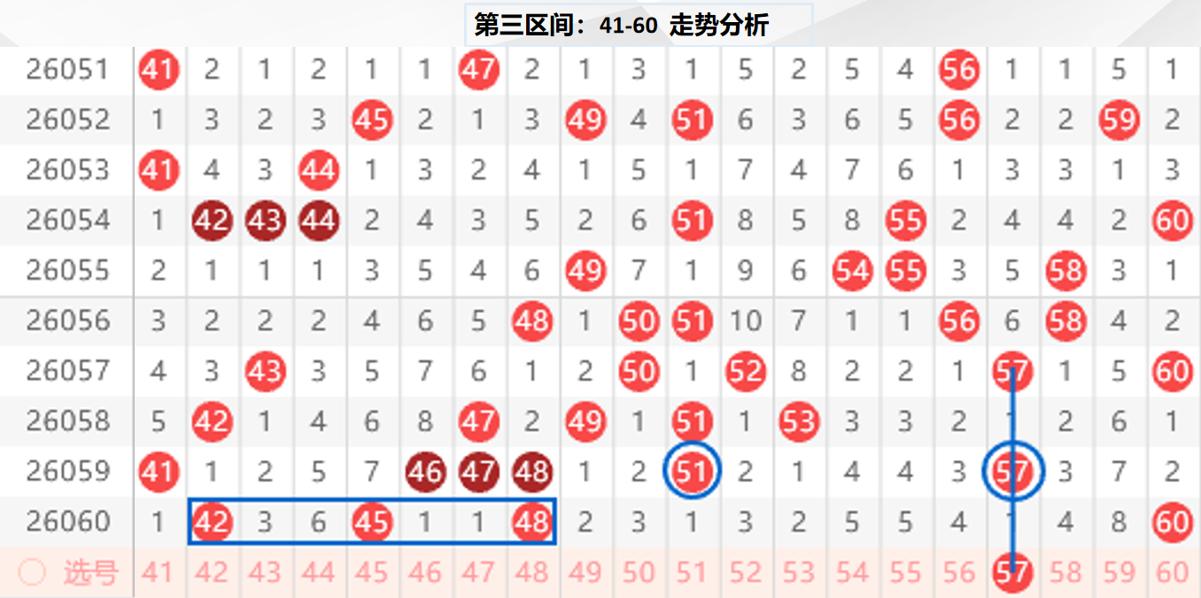 三区分析:【41-60】(走势图标注号码非小黄车大底,请谨慎参考,具体思路将在直播间分享讨论)