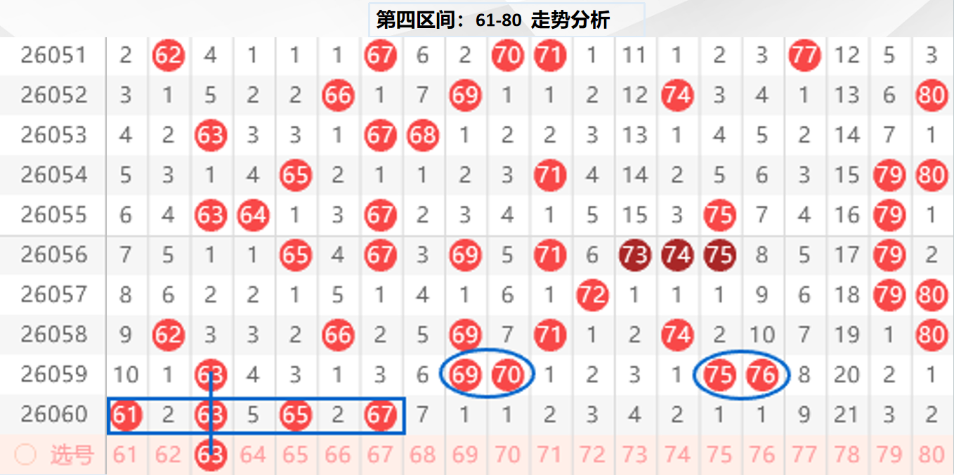 四区分析:【61-80】(走势图标注号码非小黄车大底,请谨慎参考,具体思路将在直播间分享讨论)