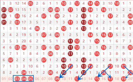 上期开出了04号数字,本期我们要注意一下分边情况和走重的情况,重点考虑一下04 05的出号情况。本期的三斜连号码有点多,在该区间三斜连号09 12 15我们是要考虑出号的,尤其是12 15的出号情况可以重点考虑一下。本期的17 19我们要注意出一个号码的情况。