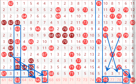 该区间的63号数字也是属于空三中心号,可以关注一下。65 67 68是属于连号空一带号,本期的我们要注意出重号的情况。上期直播时就说过01 80不做号,留到本期来做,由于上期开出了79号数字,那么本期的80号数字我们就要关注一下了。