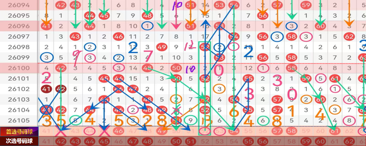 三区间推荐主做号码: 46 49 53 54 57; 防守号码:41 44 52 53;