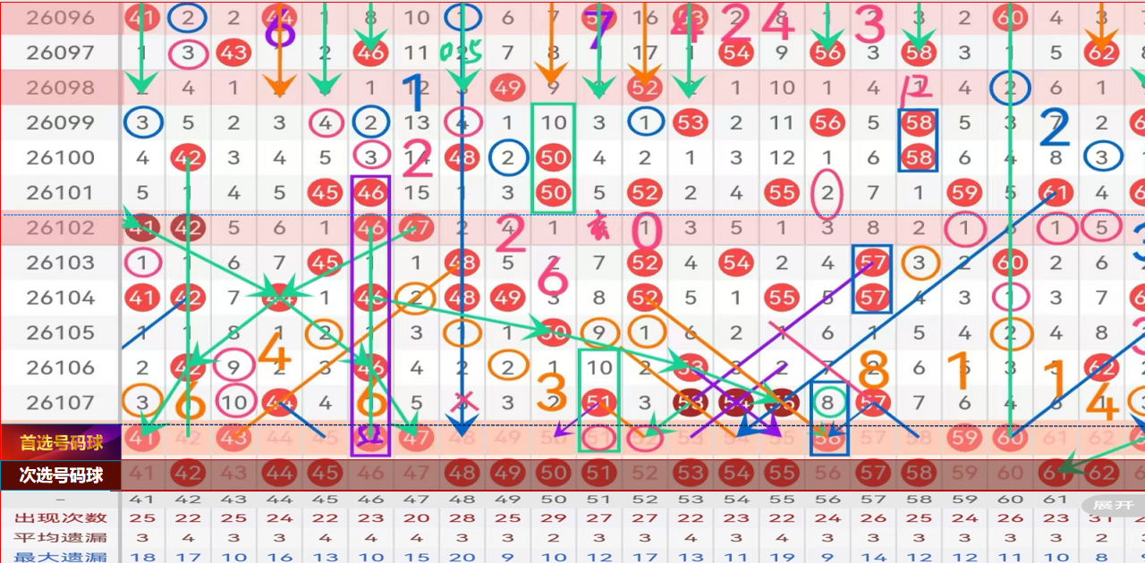 三区间推荐主做号码:41 43 46 47 56 59 60 防守号码:51 52;