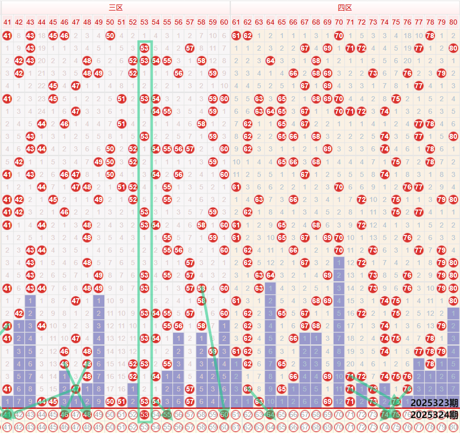 如图所示:在本期大数区的选号中注意在上期的走势中三区间开出了7枚中奖号码,落位在区间的最高位走势,同时补出45 50 51三枚遗漏十五期以上的冷号走势,因此本期的三区间走势,有着较强的下调走势,这里还要结合四区间的走势,在上期的四区间开奖结果中是开出69 71 73 75的奇数四连号走势,其中71 73 75形成了奇数的大三角走势,以及71 73的同步重号走势,从三四区间的落号形态来看,四区间的落号数量出现大幅度下调的可能性,个人认为是高位三区间的,因此本期的三区间建议可以继续考虑一期的高位走势,重点关注在上期开出45 50 51的冷号周边走势,重点关注46 47 48 49 50的位置出现号码回补,这里建议考虑46 49的号码二选一走势,选择46则注意46 48的偶数二连走势,选择49则注意44 49的双码走势,另外在近期的走势中53 54的二连落号热度非常高,在其下方的走势中出现断号的次数并不是很多,因此本期建议考虑53 54的重号选择,以及53 55的奇数二连走势,在近期的走势中69-60的交替走势频繁开出,本期要注意60的交替走势,这里要重点考虑在上期四区间开出了69 71 73 75的技术四连号,且保持着71 73的奇数双码重号走势,这里如果考虑69的重号则要注意60 69的多期交替走势下转为同出形态,7字头的号码注意74 75的落号热度,本期可以继续考虑遗漏二期的形态继续落号。