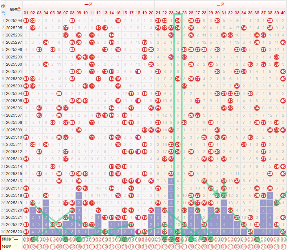 如图所示:在本期小数区的选号中,注意在上期的走势中一区间开出了4枚中奖号码,连续多起的均值走势之后,在上期的走势中一区间首次落位在均值以下的水平,重号形态出现回补,热形态走势依旧是保持着连号遗漏一期的走势,在上期开出了重号走势的01以及18 19的二连走势,出现了大面积的断号走势02-12,在近期的走势中区间的调整幅度较大,且冷号的回补速度较快,空位去的回补速度也是比较快的,因此在上期出现空位区的断号位置可以优先考虑号码的回补,重点关注02 09的交叉同路走势,以及07 16的短期遗漏双码热组合走势,二区间上期开出了4枚中奖号码,与一区间保持同样的地位走势,本期注意二区间的落号数量出现副队较大的上升走势,在开出22 25 28的同路三码走势下方开出了19 22的同路延续走势,本期这里是开出了22的重号走势,这里要注意一区间的16号延续走势,以及25 28的遗漏一期号码选择,或者是考虑22 25 28再次开出双码走势,这里要注意22号的重号三期走势,如果考虑22号的重号三期走势,这里要注意22 23的复制上方30 31的二连走势,这里要注意在上期25 28的位置下方出现断号之后,本期如果考虑单独走出遗漏一期的号码下方注意二连的号码走势,如:24 25/25 26/27 28/的二连选择,尾部位置上期开出了35 40的同步梅花形态号码,本期注意同时断号,或者是同步同向的号码选择如:36 41的顺序延续走势,或者是34 39的同步折返走势。