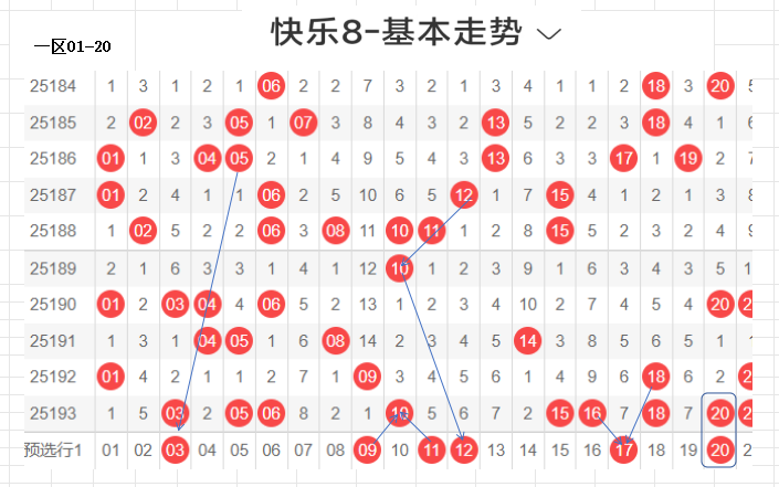 一区(1-20):遗漏5期以下有15个,0码有03 05 06 10 15 16 18 20 8个,本期注重回补.上期由于0-10小区开出4个,本区间共开出8码,回调本区,预计5码左右.近期数据奖码集中在10-20之间,平均数出码3.5.先定龙头,上期0-10区间开出4个,小区间内接下来不会走太热,维持平均出码3个左右,重点关注区间1字头热码的回补,11-20区间开出4码,小区间热码没有开出,与它有关联的码重点关注,具体分析来白菜直播间.