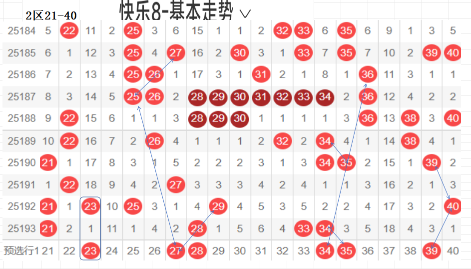 二区(21-40):遗漏5期以下有17个,0码21 28 33 34 4个,数据所示,冷码平均,选择条件增多了.上期开出了4个号码,出码比较分散.这期布防相应增加,重码按比例落这区较少,先给出重码34,这个区间间接走势,温区,21-30区间上期开了2个,依旧不是重点选号区间,31-40区间开出2个,本期关注热码的回补,间隔小遗漏值最佳,3字头转热,这个小区热码注意回调,可以做关联码的布局,注重温冷码的回补.
