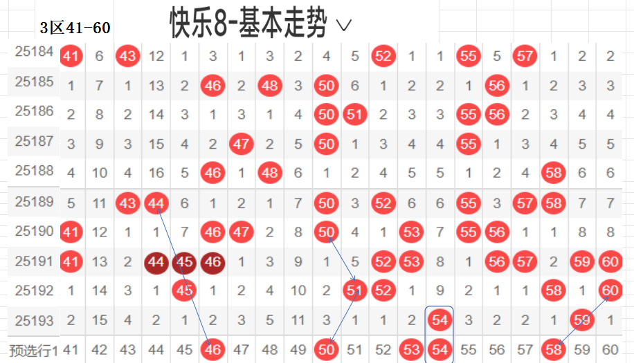 三区(41-60):遗漏5期以下有18码,0码54 59 2个,温开方式,这区码数有回暖之意,可以防一手,先定胆码走势较大者,隔期,斜三连,分边号码,可重防,间隔5期以上号码可以随走势选取,例如本期大冷码,走势比较大,可以做胆,通常联动可带出,分边对称的号码,本区间也有很大走势.可关注下.隐形夹角号码.做补位形态号码.都需要观察动态走势.以上是本区间的选码方法.