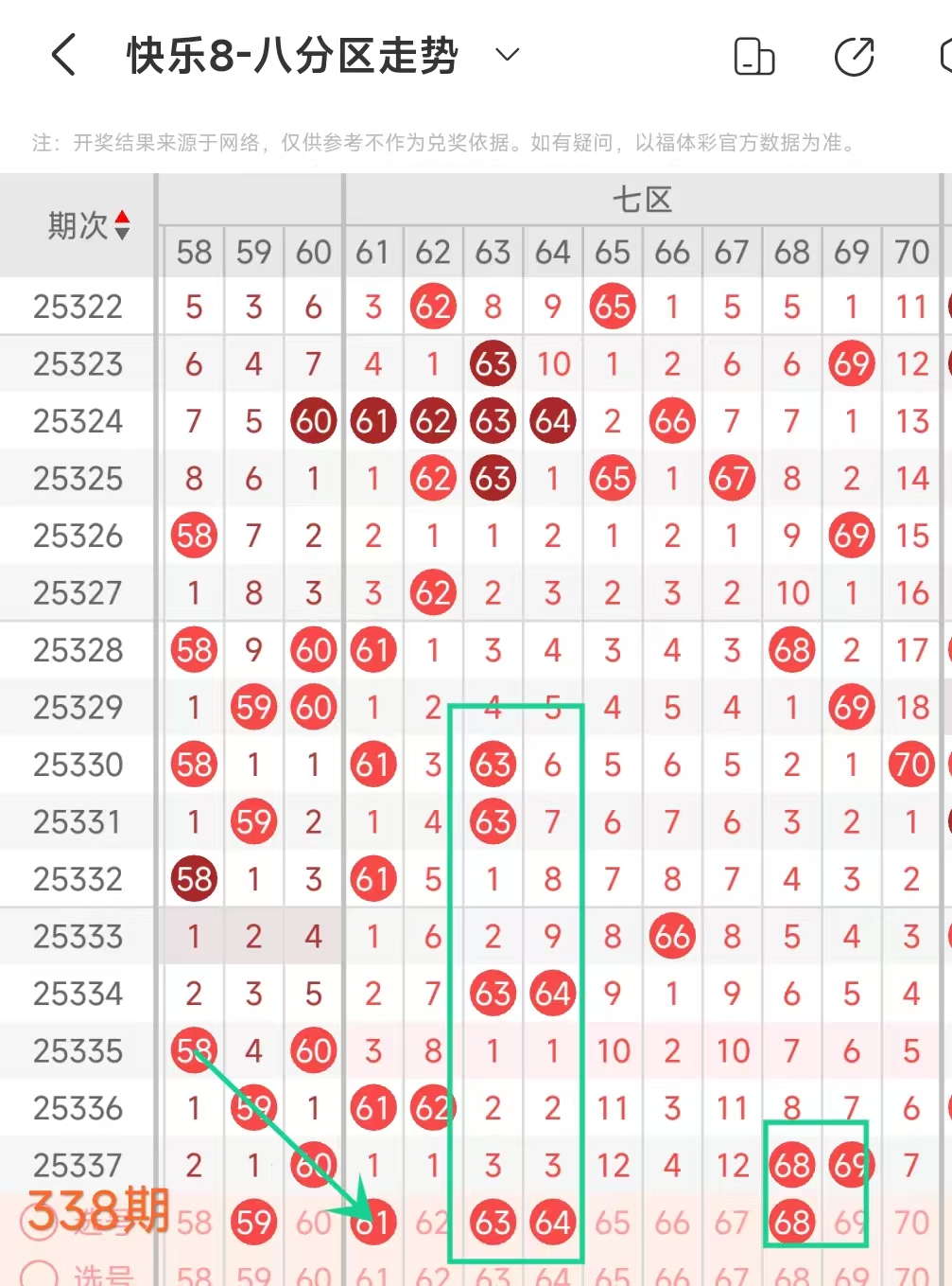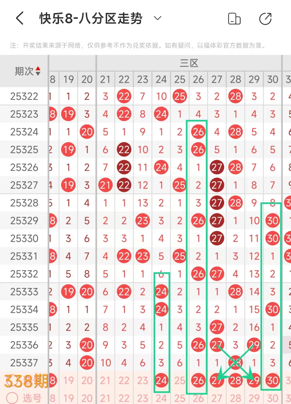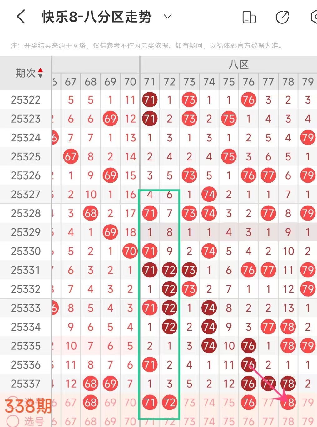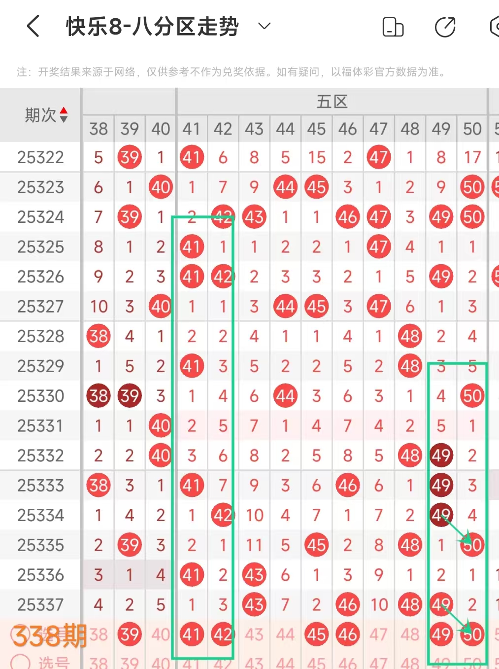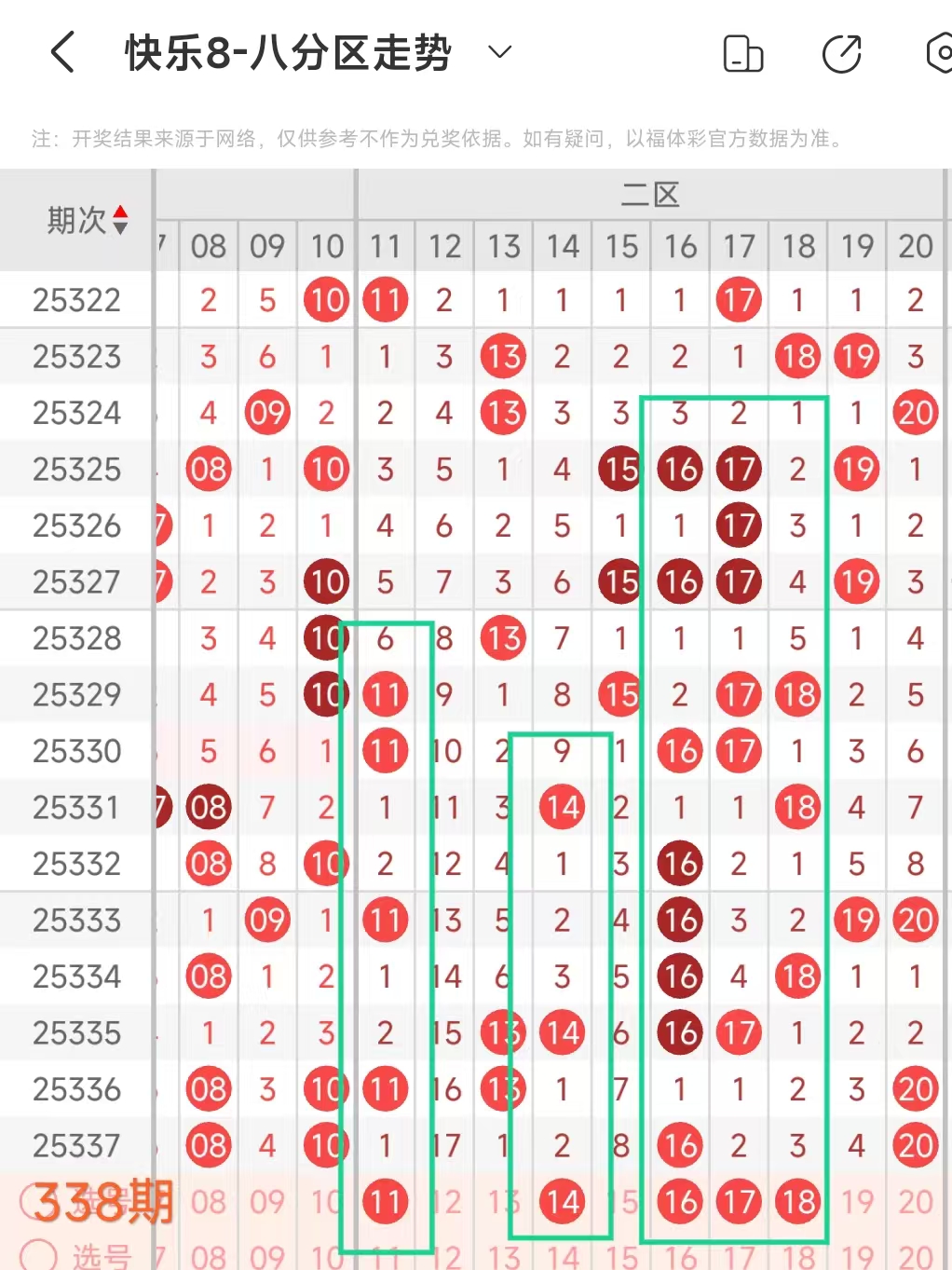 在快乐8的探索之旅中,通过对开奖走势图细致入微的观察,我们总结出一些具有参考价值的规律。几乎每一期开奖号码都呈现出以下显著特征:其一,大概率出现连号;其二,常常伴有边码;其三,遗漏值为1 2 3的号码频繁现身;其四,重号现象也较为常见。掌握这些要点,能为我们的投注提供方向指引。我们约定采用八分区走势图来展开分析。