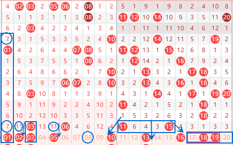 上期该区间03号数字开出来了,那么本期我们就要注意01 02的出号情况了,而且该区间的4个冷号02 04 05 09本期应该是要出号了,我们要做好防守。上期又开出了11号数字,由于上一次没有分边,那么本期出现分边的情况就大了,我们可以重点考虑一下。该区间的17 18 19号数字从本期开始我们要注意了,可以做追号计划了,本期有可能出号,如果本期不出号,那么下期开始就可以追连号了。