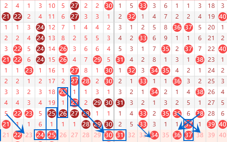上期四连号25 26 27 28落下了28号数字的重号,有点意外,那么本期我们就要注意25 26 27的落号情况了。上期开出的3连号28 29 30本期我们也是要注意落下重号来的,可以关注一下30 31号数字同出的情况。本期的37号数字我们要防守一下出重号情况,它是否在为下期出38在做准备呢?