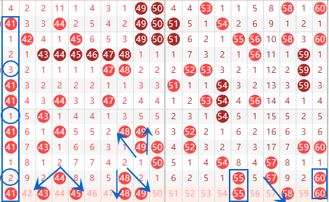 41号数字是312走势,属于乱序走势,可以关注一下。44号我们要注意一下出重号或者分边的情况,机会都挺大的。42 46都是属于空三中心号,本期是有机会开出一个号码的,我们要注意了。上期开出了60号数字,本期我们可以注意一下58号数字的出号情况。