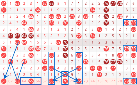 本期的两个夹号61 63是否会回补,这个一定要注意一下,64 65 66本期我们可以抓一下号码,出号机会非常大的。上期落下了70号数字,那么本期我们还是要注意70走重的情况,可以搭配68 70 72做一组防守。上期的80号数字果然开出来了,那么本期我们就要注意走重的情况了。