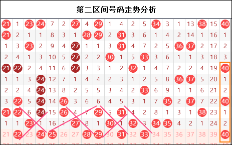 第二区间思路:二区在昨天开出 了清一色的邻码走势,作为开奖号码最多的区间,居然一个重号都没有出现,实在有点说不过去。而今天在走势上形成了纵横交错的号码依然是给人一种眼花缭乱的感觉,从前期的走位关系来看,这个看似全是斜连的趋势,实际上充满了风险,本期可以可以更多考虑一下重号和邻号的关系,减少三斜连的风险。