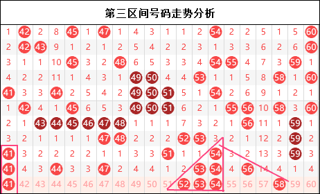 第三区间思路:三区的走势有点让人琢磨不透,前期连号与重连号集体迸发,之后转入沉寂的走势。现在走法基本傻瓜是一个让你摸不到头脑的走法,走势参考不上,形态无法参照。那剩下的我们还能做些什么,也许随机更合适,当然了开玩笑这一期三区还是有不错的形态的,至少三角杀可以当作参考使用。