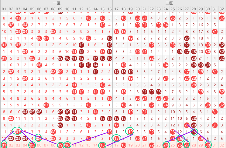 二区胆尾6尾7尾,边号18 19 22 24  26 17 28 30出一码,重号17 20 21 25 26 29出一码,形态上24 27 30是斜连号,缩小范围1开头不出边号,2开头稳定出边号,看好24 26 27出一码,近期重号出在2开头25以后,那么本期大概率是25 26 29出一码,看好26,其次7尾不单出,1开头没重号,那么本期27可以摁,很大概率26 27要出连号,3开头有一码30 31 32三出一,接着守一期32,9尾出2期看19,防18结论关注四码19 26 27 32防18