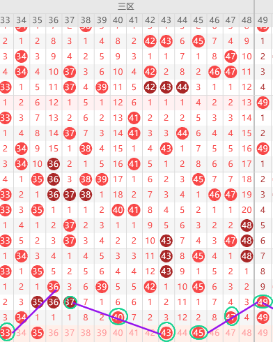 三区胆尾3尾4尾7尾,边号33 35 39 41 46 48出一码,重号断一期如果回补34 40 47出一码,形态上33 43 45是斜连号,上图已勾画,重号先看34其次47,近期大趋势遗漏值12期爱出,所以本期44要关注,结论关注五码33 34 39 44 46