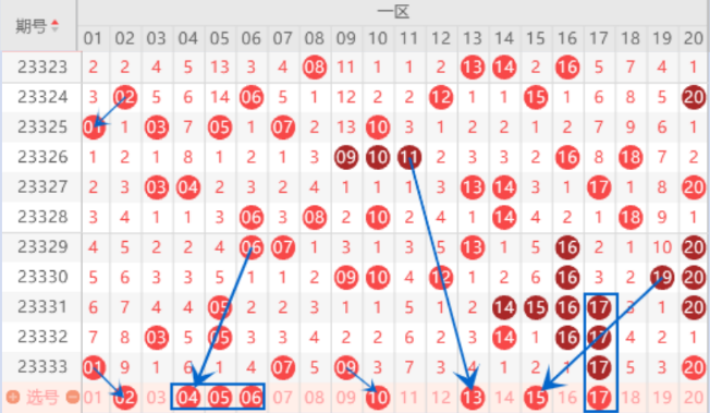 该区间的02号数字是属于遗漏9期的号码,本期遗漏9期的号码有5个,本期是有机会出2个号码的,我们要重点考虑一下。本期的04号数字我们做一下防守就行了,走势虽然好,但是不一定会出号。本期的05号数字我们关注一下,毕竟上期开出了09号数字,有可能会把本期的05号数字带出来的。本期的10号数字也是要关注一下的,防守一下09 10号数字同出的情况。本期的17号数字我们注意一下出现4重号的现象。