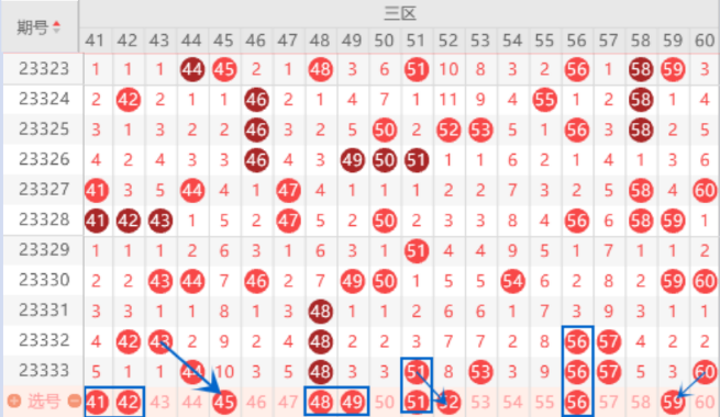 由于上期41 47号数字一个都没有开出来,那么本期我们在继续做一期看看,本期我们重点关注一下41号数字的出号情况,防守一下41 42号数字同出的情况。本期的45号数字是属于遗漏10期的号码,本期遗漏10期的号码有2个,本期是有机会出一个号码的,我们需要注意一下。本期的48号数字我们注意一下出现4重号的情况。本期的49 50号数字我们要注意出一个号码的情况,重点关注一下49号数字的出号情况。上期开出了51 61号数字,本期我们要注意一下出一个重号的情况。上期开出了56 57号数字的重号,本期我们注意一下出现3重号的现象。