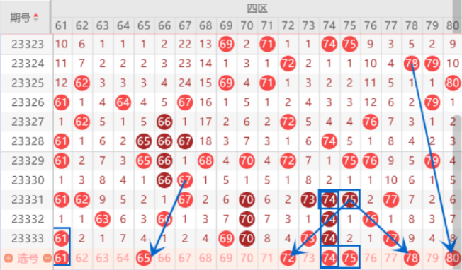 本期的65号数字我们要重点考虑了,如果本期的70号数字走不了4重号,那么本期的65号数字出号机会就非常大了。本期的72 75 78号数字我们要注意一下,属于2路号码,在该区间已经遗漏2期了,本期有机会出一个号码的,我们需要重点注意。本期的74号数字我们要注意一下出现4重号的情况,防守一下74 75号数字同出的情况。本期的80号数字我们在做一期看看,毕竟上期那么好的走势都没有出来,本期有可能会出现回补情况。