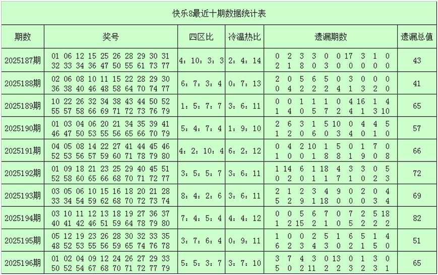 一、快乐8第2025197期奖号分析(定义:遗漏0-2期号码为热码,遗漏3-6期号码为温码,遗漏7期及7期以上号码为冷码,重码为上期开出奖号,邻码为上期没有出现,但与上期奖号差值为1的号码,例如上期开出奖号04,没有出现号码03和05,则本期03和05都为邻码,其它则为孤码。