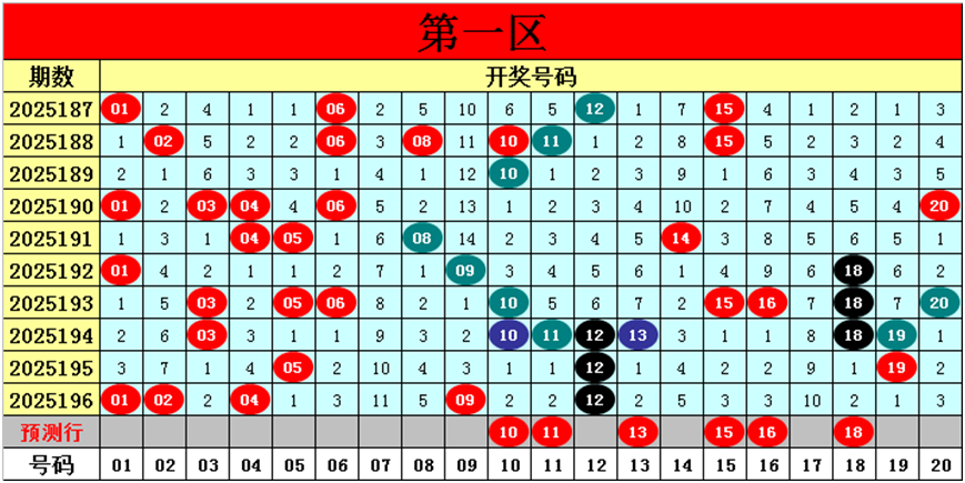 目前第一区包含12个热码:重码5个01、02、04、09、12,邻码5个03、05、10、11、13,孤码2个18、19;包含6个温码:邻码1个08,孤码5个06、14、15、16、20;包含2个冷码:邻码0个,孤码2个07、17;号码冷温热个数比为2:6:12,重号、邻码、孤码个数比为5:6:9。