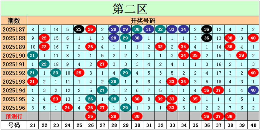 目前第二区包含13个热码:重码5个24、26、27、29、33,邻码4个23、28、30、32,孤码4个35、36、37、40;包含5个温码:邻码2个25、34,孤码3个21、22、39;包含2个冷码:邻码0个,孤码2个31、38;号码冷温热个数比为2:5:13,重号、邻码、孤码个数比为5:6:9。