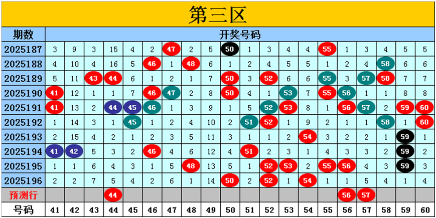 目前第三区包含12个热码:重码3个50、52、54,邻码3个51、53、55,孤码6个41、42、46、48、56、59;包含6个温码:邻码0个,孤码6个44、45、47、57、58、60;包含2个冷码:邻码1个49,孤码1个43;号码冷温热个数比为2:6:12,重号、邻码、孤码个数比为3:4:13。