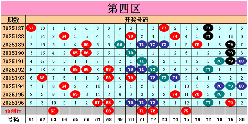 目前第四区包含13个热码:重码7个67、68、70、71、72、77、79,邻码3个76、78、80,孤码3个64、65、74;包含3个温码:邻码2个66、73,孤码1个62;包含4个冷码:邻码1个69,孤码3个61、63、75;号码冷温热个数比为4:3:13,重号、邻码、孤码个数比为7:6:7。