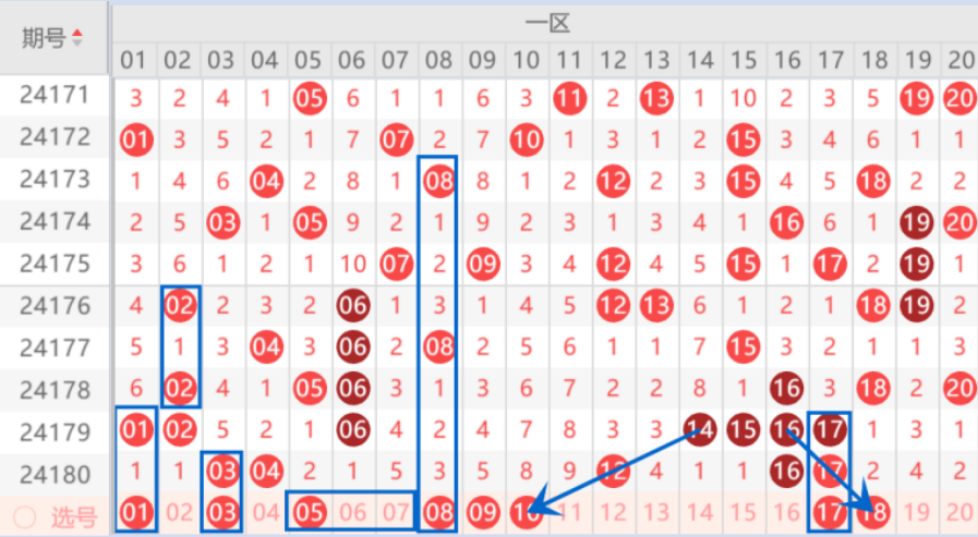 该区间的01号数字我们注意一下出号情况,做一下防守就行了。本期的03 04号数字我们要重点关注一下,这里出一个重号的机会是很大的,可以重点关注一下03号数字的出号情况。本期的05 06 07数字我们注意出一个号码的情况,重点关注一下05号数字的出号情况。本期的08 09 10号数字我们注意出一个号码的情况,其中的09号数字我们可以重点关注一下。上期开出了16 17号数字的重号,本期我们注意一下出一个三重的情况,重点关注一下17号数字出三重的情况。本期的18号数字我们注意一下出号情况,属于三斜连号码。