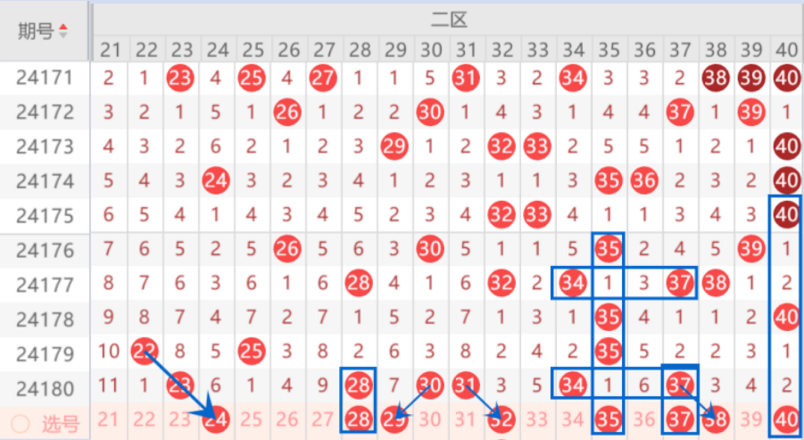 本期的24号数字我们注意一下出号情况,属于三斜连号码。上期开出了连号空一带号28 30 31号数字,本期我们注意出一个重号的情况,最好是做一下防守就行了。本期的32号数字我们注意一下出号情况。本期的35号数字是属于空一对称号码,又是复制号码,可以重点关注一下出号情况。本期的38号数字我们注意一下出号情况,这里可以防守一下38 40号数字同出的情况。
