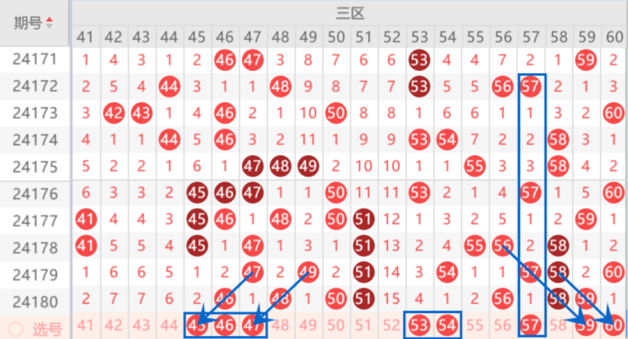上期开出了46 48 50 51号数字,本期我们注意出一个重号和一个夹号的情况,重号我们重点关注一下46号数字,夹号我们重点关注一下46号数字的出号情况,本期的45号数字是属于断V型号码,本期我们注意一下出号请,所以这里我们可以防守一下45 46 47号数字同出的情况看。本期的53 54号数字我们注意一下出一个号码的情况。本期的57号数字我们可以重点关注一下,属于212走势,出号机会很大。本期的59 60号数字都是属于斜连号码,出号机会是有的,我们要注意出号情况。