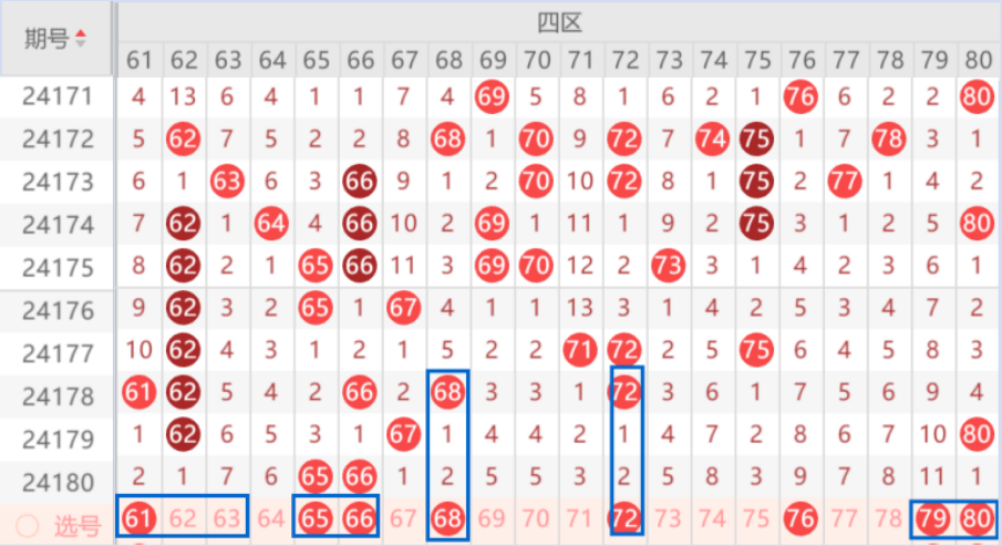 本期的61 62 63号数字我们注意出号情况,属于重号边号回补号码,这里我们可以重点关注一下61 62号数字的出号情况。上期开出了65 66号数字,本期我们注意一下出一个重号的情况,重点关注一下66号数字的出号情况。本期的68号数字我们可以重点关注一下出号情况,属于交叉对称号码回补号码。本期的76号数字我们防守一下出号情况,属于遗漏9的号码,本期遗漏9的号码有3个,出一个的机会是很大的。本期的79 80号数字我们防守一下同出的情况。