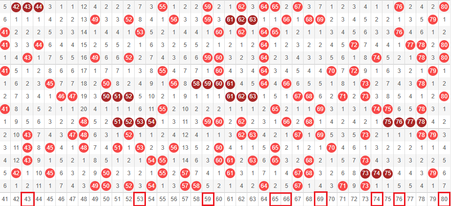 接下来我们一起看走势图,我们把01-40分为前区,41-80分为后区。