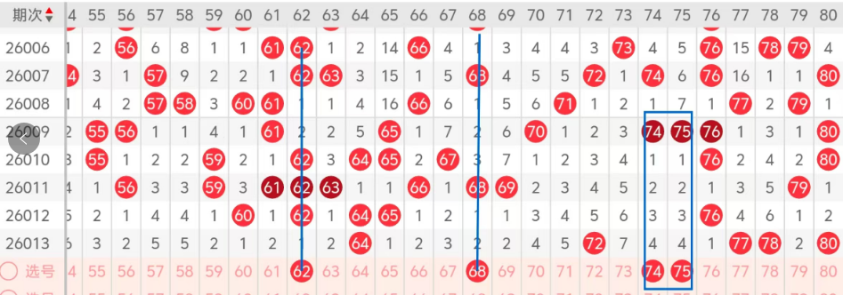 第四区间的走势分析:第四区间上期开出了五个号码球,主要的落号点位在四区间的后半区,走出了一奇四偶的形态走势,上期四区间的前半区落下了一个号码球,后半区落下了四个号码球,整个四区间处于走热的趋势,根据四区间的走势规律,今天的四区间我们主看前后半区边码的落位,前半区主看62 68热码也是边码的落位,落下一码的机会很大,再看后半区74 75姊妹对组合的回补,落下一码的机很大,这四个号球建议大家打个四码复三,或者打个四码复二比较稳妥,参考为主!