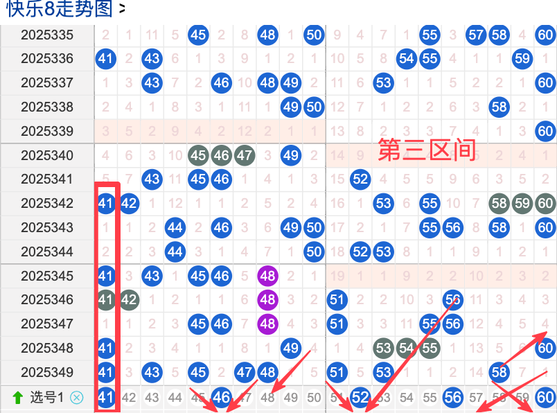 三区间开出了8个奖号(41.43.45.47.48.51.53.58)上期回顾三区开出8个奖号上期的三区间的奖号数量呈现一个递增的形态,4头回补5个,本期先来看号码41近期出现频率相对来说还是很稳定。偶尔有时间隔期数也是很长,说明其在近期的开奖中较的,号码46在近 30 期内出现次数相对是稳定的号码,近期的活跃度也是较。号码58有一定的间歇性,通常间隔5-4期会出现一次,没有明显的连续出现态势,走势相对较温热,在整个第三区间的表现本期还是可以防守的。号码56走势相对近期较温热,近期没有连续间隔落号的情况,活跃度近期处于较温热状态注意防守。