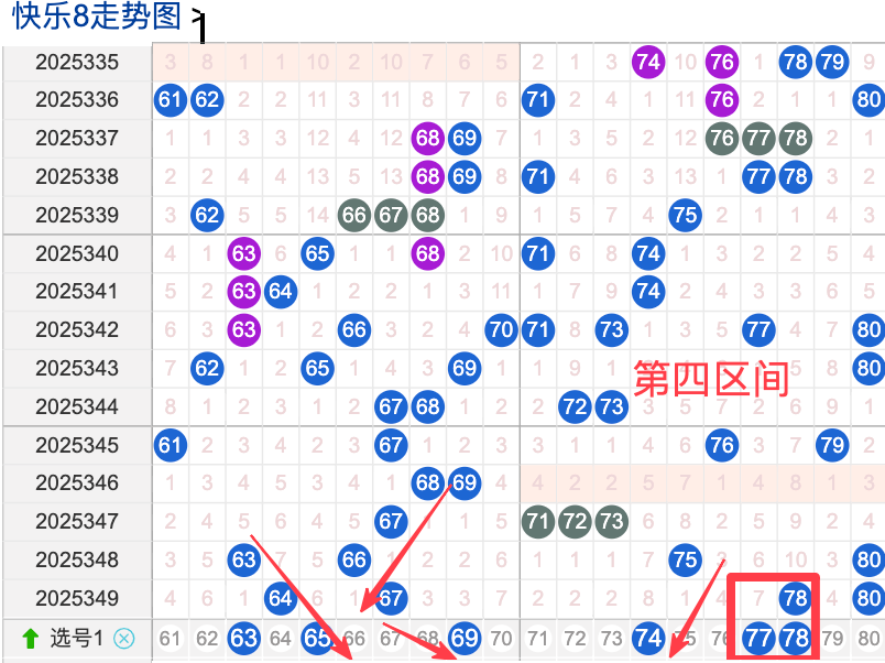 上期四区间开出了4奖号(64.67.78.80)上期的四区开4个奖号呈现了一个不变的趋势,开出的奖号7头回补1个6头回补2个,先来看号码63在近 30 期内属于还很稳定的号码,近期出现频率相对稳定的,偶尔会间隔多期后出现一次,这个号码要注意防守,号码69具有一定的间歇性活跃度较比如有时会间隔 35期就再次出现,也有时会间隔多期,近期整体出现频率比较,近期还是要关注的.号码77活跃度近期比较,有一定的间歇性。活跃度近期较热,整体走势有一定的波动性.