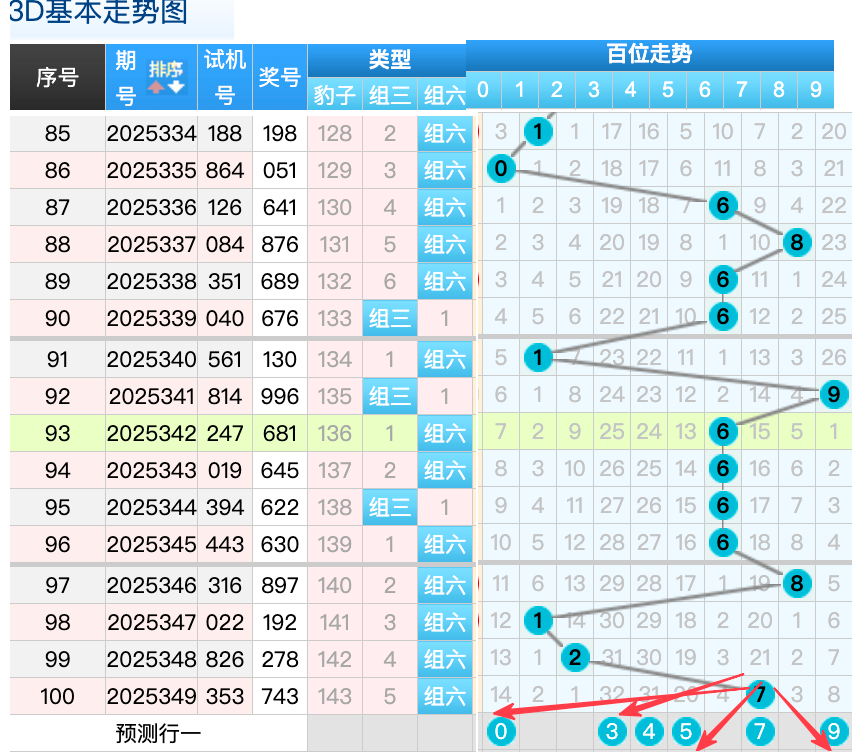3D上期百位开出的7球,这个奖号是一个冷码回补落位趋势也是一个比较好的符合百位上的落位点,先来看9号球这里还是有机会继续走出一个常搭配的趋势也是一个冷码的回补号码,还有一个就是4号球和5号球这里的号码落位形态的概率在这里的机会还是很好的要注意防守,然后0号球这里要注意也是一个大号回补落位趋势要注意防守,7号球在百位上要注意可能有机会走出重码回补的落位注意防守 。
