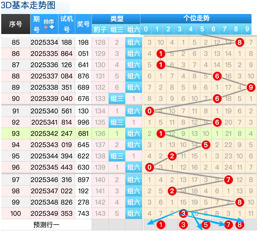 上期的3D个位开3号球,上期开出的是组按照形态的话本期打组六形态,上期的3号球的落位是个位上的一个冷码回补的落位趋势,本期先来看1号球在个位还是有机会继续走出小号落位点这里要注意是一个顺位码的落位点,7号球和5号球是这里的落位点是两个小周期号码的落位点这里注意防守一码就好了也是这里的两码走势都是非常好看的注意选择一码,再看8号球这里注意走出拉拽的落位形态