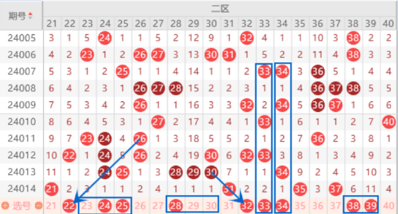 本期的22号数字我们注意一下,本期是属于斜5连号,还是有机会出号的。本期的23 24 25号数字我们要注意出一个号码的情况,重点关注一下24 25号数字的出号情况就行了。本期的28 29 30号数字我们要注意回补一个号码的情况,这里重点关注一下28 30号数字出号情况就行了。本期的33 39号数字都是属于空三中心号,本期的空三中心号有五个,出一个是没有问题的,我们重点关注一下33 39 60号数字的出号情况就行了。