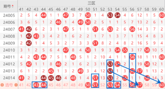 该区间的43号数字我们注意一下出号情况,属于4斜连号码,本期的4斜连号码有两个,有机会出一个号码的。三连号44 45 46号数字我们注意一下走重的情况,重点关注一下44 45号数字走重的情况。本期的50号数字我们注意一下,属于434走势,出号机会还是有的。上期开出了51 53 55号数字,本期我们注意一下出一个重号和一个夹号的情况,重点关注一下51 53 54号数字的出号情况。本期的56 57号数字我们注意一下出号情况,本期有机会出一个号码的。