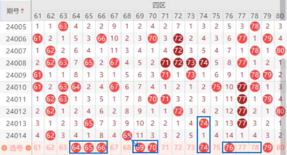该区间的64 65 66号数字我们注意一下出号情况,64号数字是属于484走势,65号数字是属于空一回补号码,66号数字是属于遗漏8期的号码,本期遗漏8期的号码有2个,还是有机会出一个号码的,所以这里我们要重点关注一下。本期的66 70号数字我们注意一下同出的情况。本期的76 77 78号数字我们注意一下回补一个号码的情况,重点关注一下76号数字回补的情况。