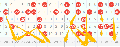 第二区间号码21-40,五期内遗漏号码28,30,36,本期因为走势关系基本都会走下来。鉴于第二区间也出现三连号,告诉大家一个秘密,三连号火四连号一旦出现,下一期必有其中一个号码出现。