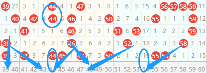 第三区间号码41-60,五期内遗漏号码43,48,49,54,60.除了60,其他本期都有走势可以关联。但本期本区号码一定会有所减少。这是需要注意的地方。