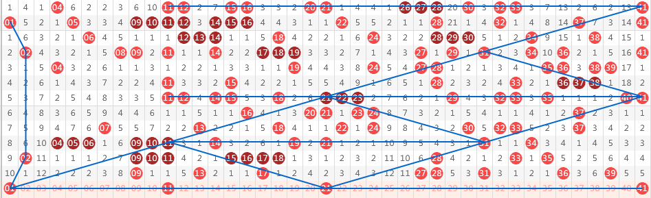 【第一区间1-40】上期开出8个号码。本期分析推荐号码01-11-13-15-16-20-21-24-27-37-39-40共12个号码,其中一小区和二小区分别6个号码。01为遗漏10期特别号码,也是1尾斜连号码;11、13、15主要从奇数走强形成奇数连号形态考虑,同时,它们每个号码都有同路、斜连形态,16同路和斜连号码;20本身是斜连四期号码,20、21以对子在此坐标处回补开出,二者是考虑重点号码;2字头主要考虑以1-4-7同路形态号码;37为斜连五期号码,虽然不常见,但作为7尾斜连三期号码,有较高开出概率;39同路号码,40尾0尾四斜连号,39-40-41在此处形成连号回补。区间推荐重点号码:01-11-13-15-20-21-27-37-39-40。